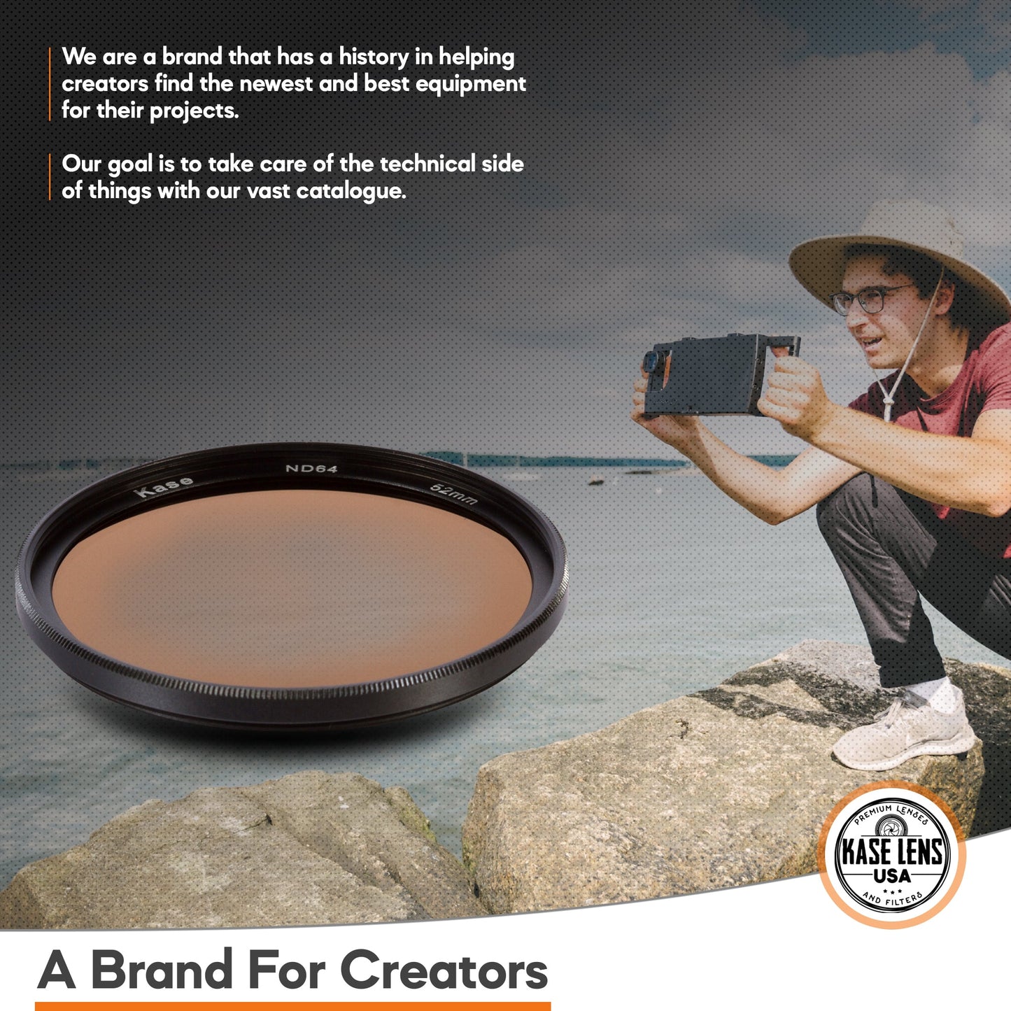 The atmospheric conditions have to be taken into consideration when you plan your shots. The amount of light, the number of reflections, and glare can even ruin your footage. That’s why you need filters for your camera to address these situations as they arise. We offer you the Kase 52mm ND64 Lens Filter. It is another quality product in our catalog that will certainly be of great help with its usefulness and efficiency. Every little accessory that you have in your rig can turn a good picture into a great one.