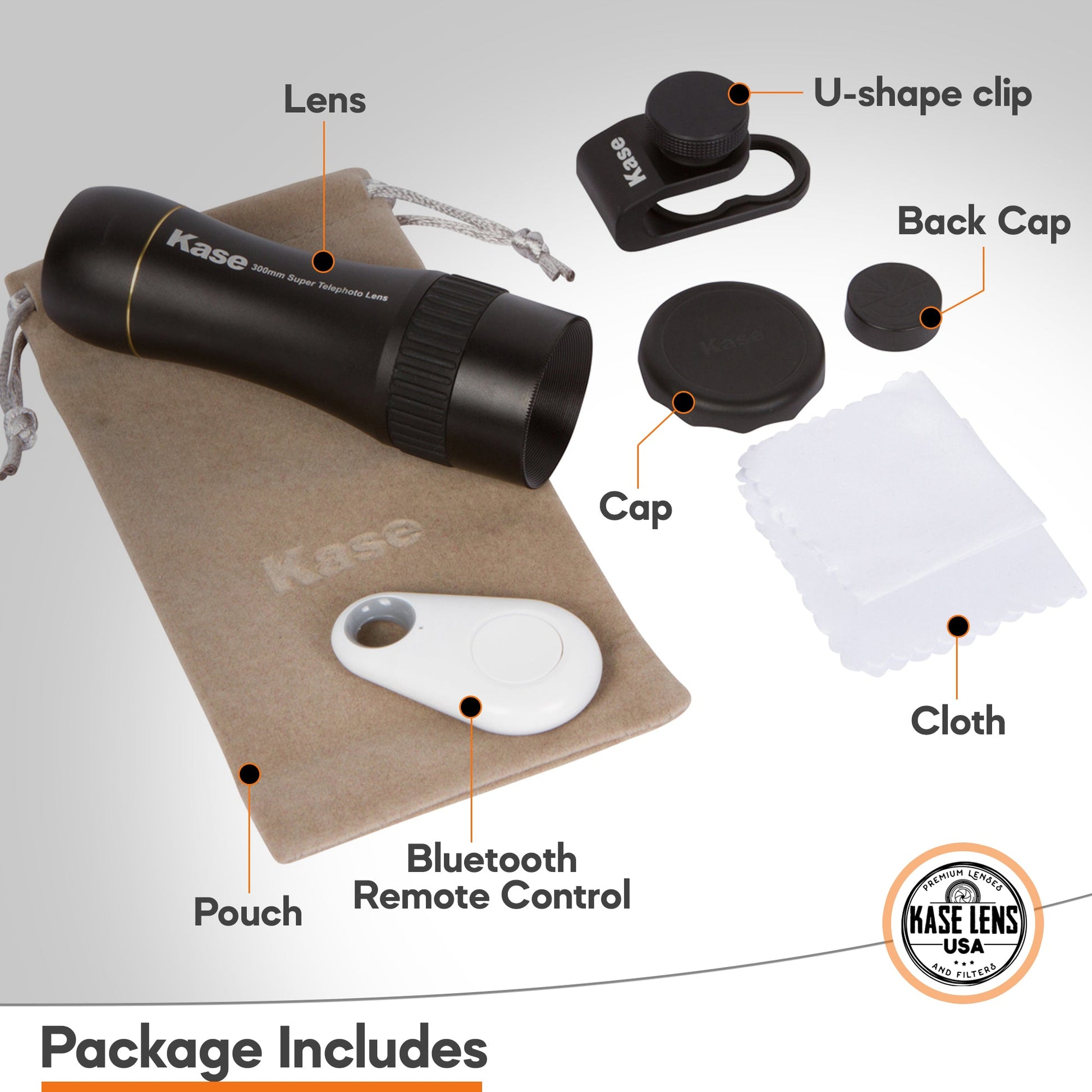 The package includes the Kase Lens, a pouch for safe storage, a U-shape clip for easy attachment to your device, and Bluetooth remote control, which works with Apple Camera. Our recommendation is to attach it to our special Kase Lens Holder Case for the best results (sold separately). We made sure that only high-quality materials are used in the production of this item. The body of this product is made of a high-quality aluminum alloy and the lens itself is B270 cinema-grade glass. The aluminum alloy makes it lightweight with a weight of just 142g, while B270 glass is reliable, highly transparent, and offers outstanding optical performance. This item has a diameter of 35mm and a length of 110mm.