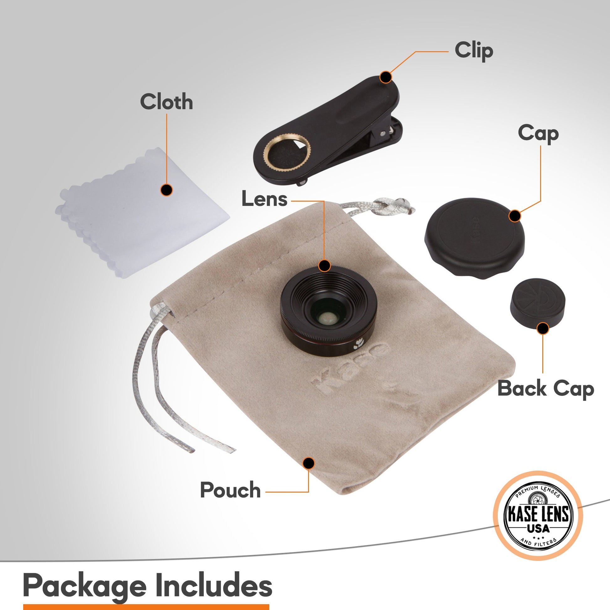 We made sure that only high-quality materials are used in the production of this item. The body of this product is made of lightweight high-quality aluminum alloy. The lens is made of hand-polished optical glass with a coating that minimizes ghosting, unwanted reflections, distortion, and flares. The high quality of the materials ensures the sturdiness, durability, and long life of the product. The package includes the lens, a U-shape clip for secure attachment to your device, a pouch for safe storage and protection, instructions, and a cleaning cloth. Our recommendation is to attach it to our special Kase Lens Holder Case for the best results (sold separately).